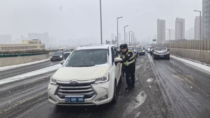 针对降雪后易出现积雪结冰的路段、桥梁、隧道及高架桥匝道等重点区域,郑州交警部署加密巡逻频次,开展不间断巡查管控。在高架桥梁、坡道弯道、学校医院周边等易结冰、易拥堵重点路段,执勤交警顶风冒雪坚守岗位,手持指挥棒疏导车流,提醒过往车辆减速慢行、保持安全车距。截至12日下午15时,郑州交警共出动警力1753人次,警车401辆次,应急车3辆。
